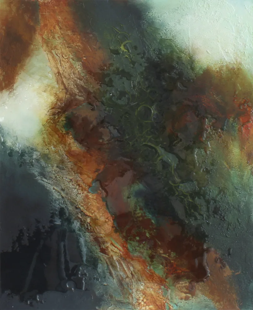 Værket er udført med akrylmaling, struktur paste og ArtResin