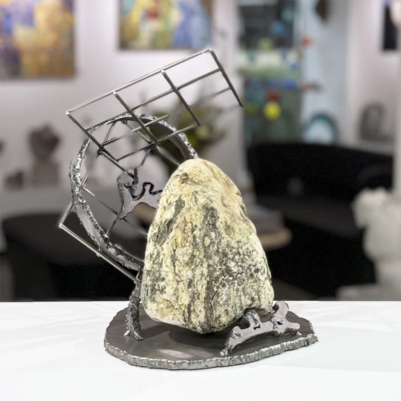 De senere år har han åbnet sine værker for naturens materiale: sten, granit og enkelte træstykker, fundet som små hemmeligheder på strande og stier. Disse elementer bærer tid i sig – tid, som står i skærende kontrast til jernets eksplosive forandringer.